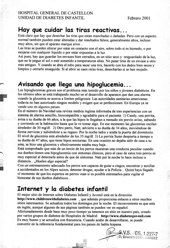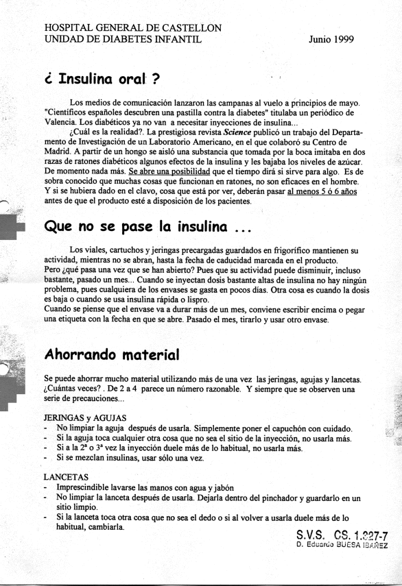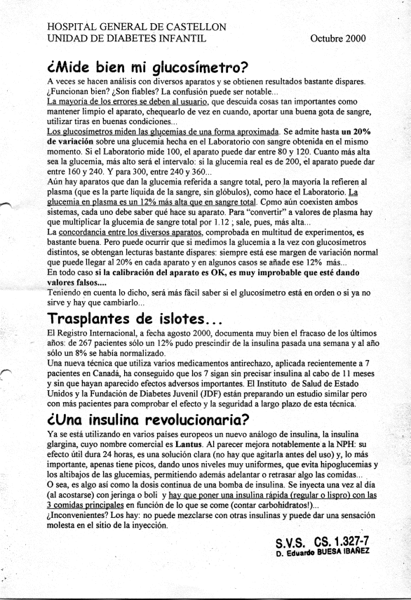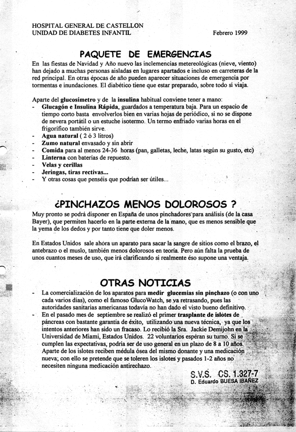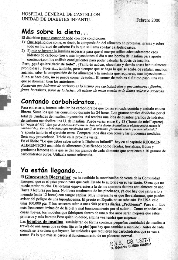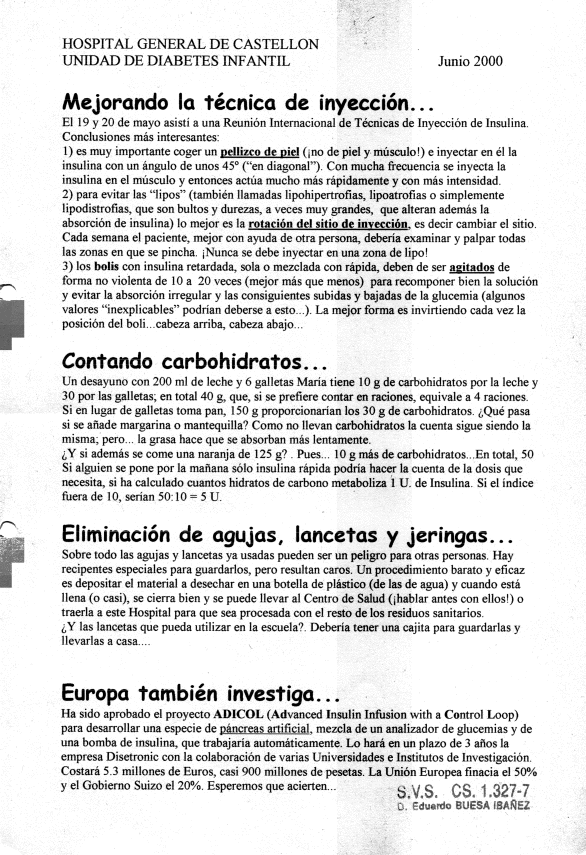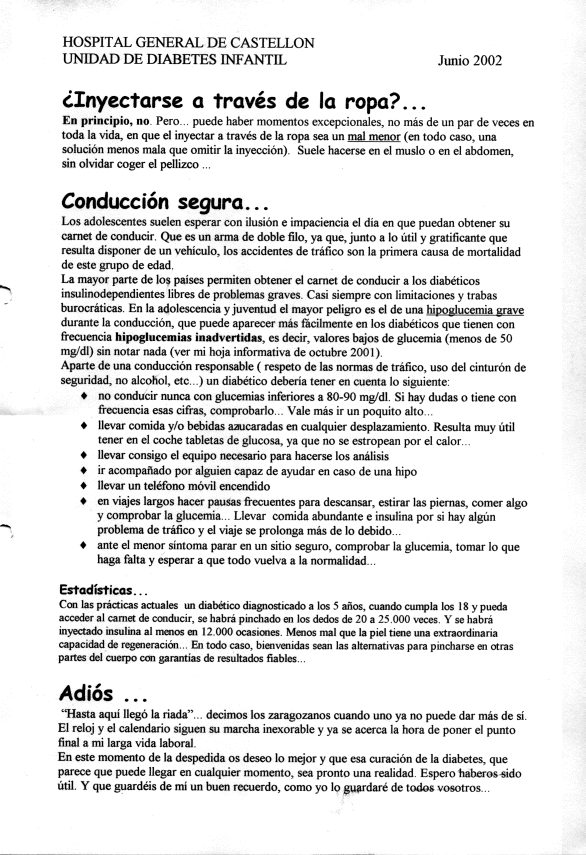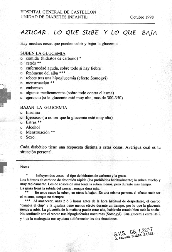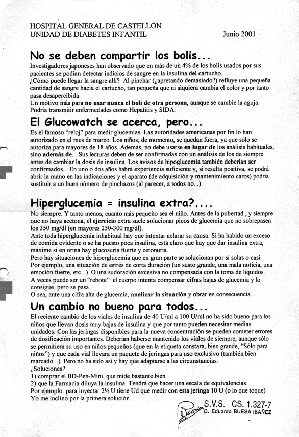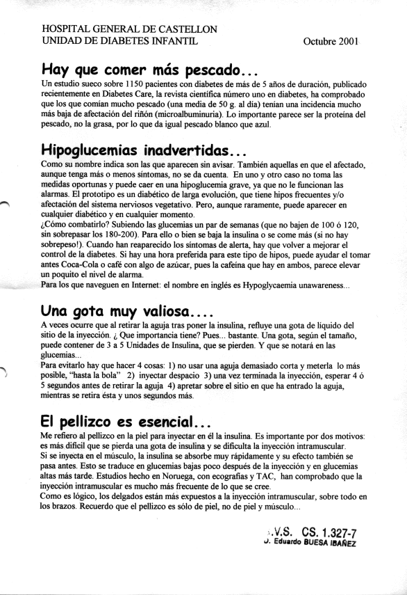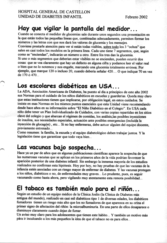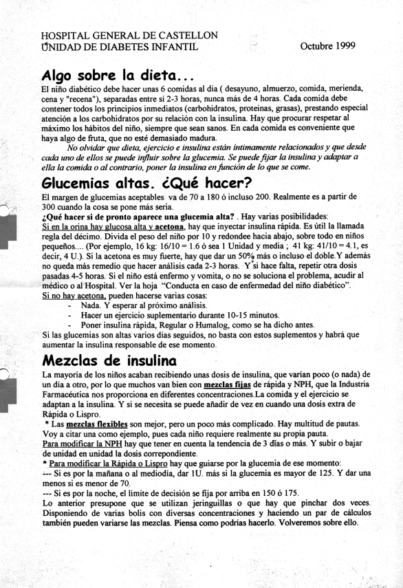 Los pacientes de la Unidad de Diabetes Infantil del Hospital General de Castellón recibían en cada visita programada (que por razones logísticas era cada 4 meses) una Hoja Informativa con algunos consejos y comentarios. Aquí pueden verse las doce últimas.