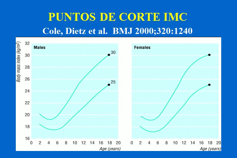 El gráfico de Cole y Dietz muestra los IMC que en los niños se corresponden con los límites de sobrepeso y obesidad en los adultos: