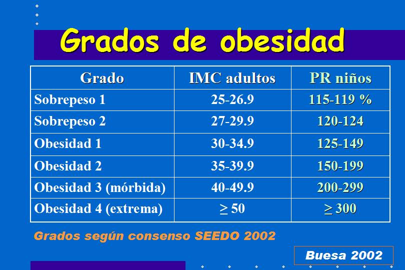 El peso relativo (PR) se obtiene multiplicando por 100 el peso real del niño y dividiendo luego por el peso que corresponde al p50 de su "edad talla". En mi opinión es el índice que mejor valora el peso a cualquier edad. En la tabla adjunta he calculado los PR de los niños que se corresponden con los IMC de los adultos, según la clasificación que recomienda la SEEDO, siguiendo la norma internacional.